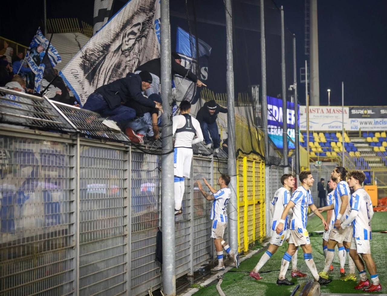Lorenzo Sgarbi (près de la barrière) a célébré avec exubérance son premier but devant les supporters visiteurs. © Pescara Calcio