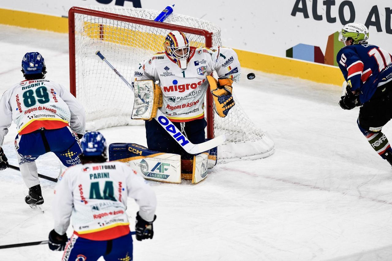Le duel entre les deux équipes d'AlpsHL était pratiquement plié après seulement sept minutes ! Asiago menait déjà 4-0. Le premier but de Stellati fut emblématique : dans une mêlée, Marco Insam, de Ritten, tenta de dégager le palet, mais heurta la crosse de Filippo Rigoni II – et de là, le palet glissa entre les jambes du gardien Colin Furlong pour finir au fond des filets.