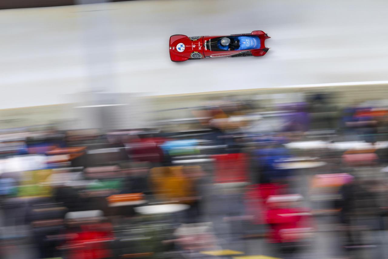 Patrick Baumgartner avec le pousseur Robert Mircea dans le bob à deux. © ANSA / CHRISTOPHER NEUNDORF