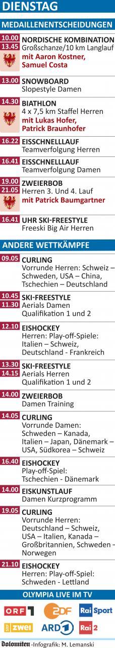 Aujourd'hui, mardi, plusieurs épreuves médaillées – dont certaines impliquant des athlètes du Tyrol du Sud – sont au programme des Jeux olympiques d'hiver.
